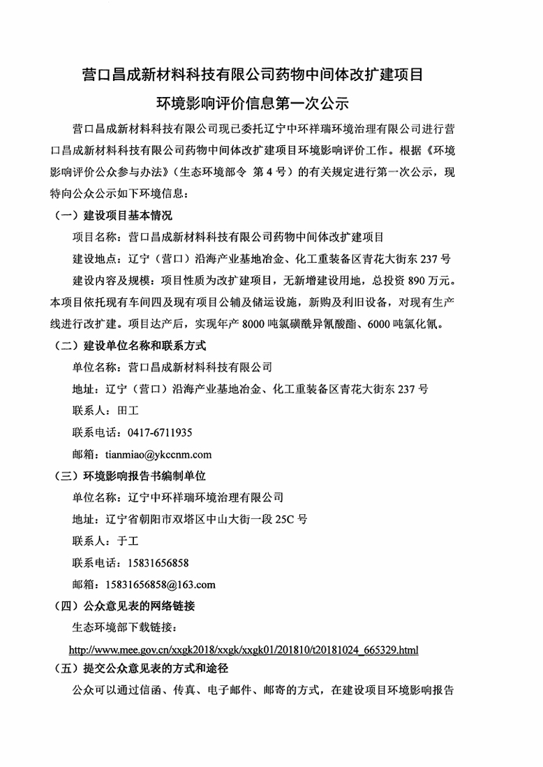 營口昌成新材料科技有限公司藥物中間體改擴(kuò)建項目環(huán)境影響評價信息第一次公示